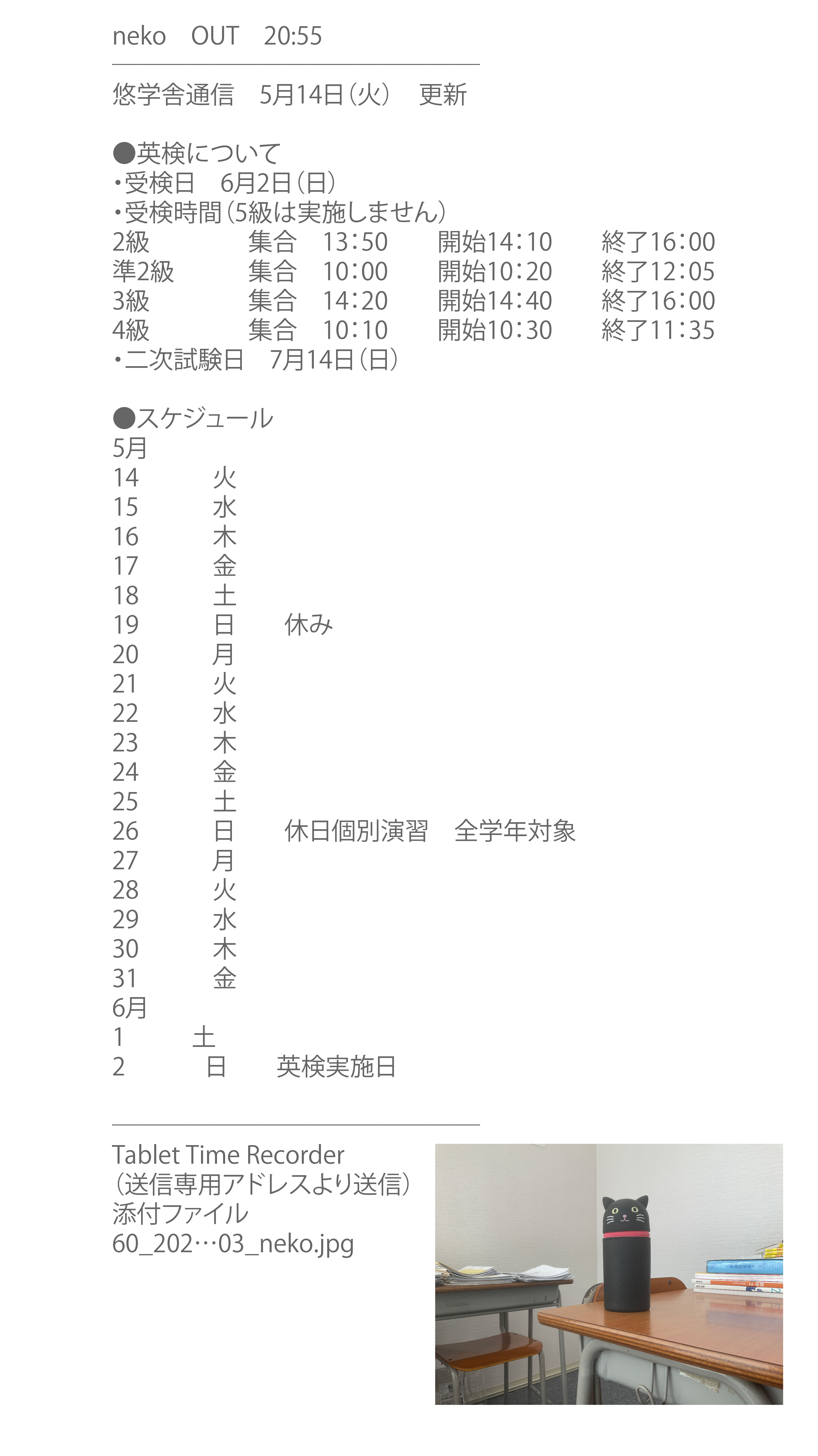 悠学舎では、生徒の入退室時に、リアルタイムで写真付き悠学舎通信メールでお知らせしています。通信メールでは、悠学舎の予定、模擬テストや英検や漢検などのお知らせをしています。